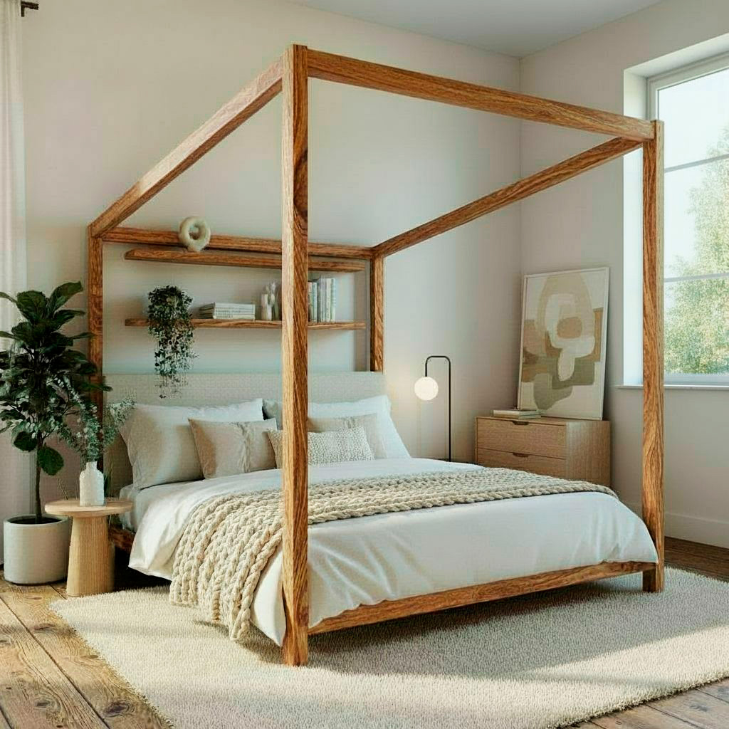 Bedroom designed with a touch of modern vintage style, built with excellent materials, ideal for small and large spaces, since due to its geometry, it creates a sense of depth that also frames your resting place. Bedroom built in 18mm parota plywood, with internal metal structure, with 2 ”x 3” solid Parota wood posts, with vintage type 18mm melamine board headboard, does NOT include mattress. Dimensions: Width: 190cm Deep: 230cm Height: 220cm