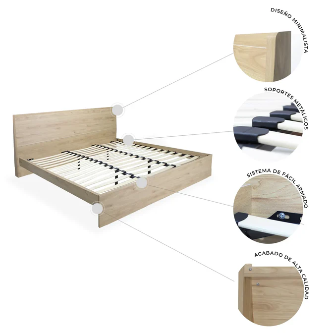 La cama matrimonial CACTU combina un diseño minimalista con materiales de alta calidad, ideal para transformar tu dormitorio en un espacio moderno, cómodo y funcional. Su estilo simple y su elegante acabado la convierten en una opción perfecta para decoraciones contemporáneas y minimalistas. Esta cama está fabricada con una estructura robusta y soportes metálicos resistentes, que garantizan estabilidad y durabilidad durante años. Gracias a su sistema de fácil armado, podrás montarla de manera rápida y sencilla, permitiéndote disfrutar de un mueble funcional sin complicaciones.