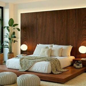 Acabado en chapa de madera de Encino a doble tono y cabecera en capitonƩ en tela lino.